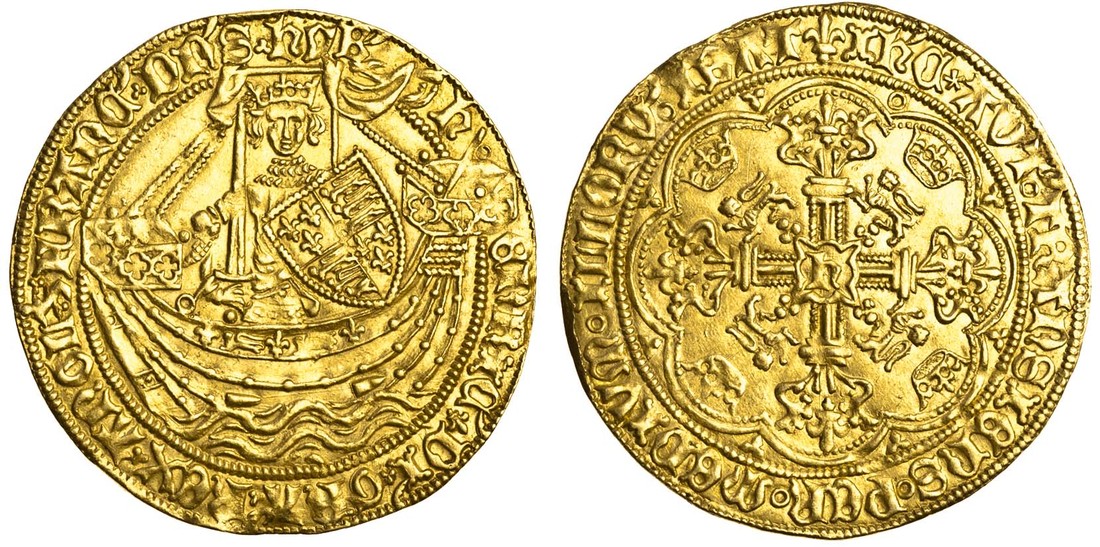 Henry VI 1íst reign (1422-61), London, Noble, Annulet issue, 6.94g, mm. -/lis, h/enric’• di’• gra’• rex• angl’• z• franc’• dn’s• hyb’, lis before di otherwise trefoil stops, king with sword and shield facing in ship, rev. ih’c* avt’ transiens per medivm illorv’ ibat, royal cross within tressure, h in panel at centre, trefoils and one annulet in spandrels (N.1414; S.1799; Schneider 278; Stewartby IB: Whitton 4e), a scuff on reverse rim at 9 o'clock, otherwise a well struck coin, good very fine