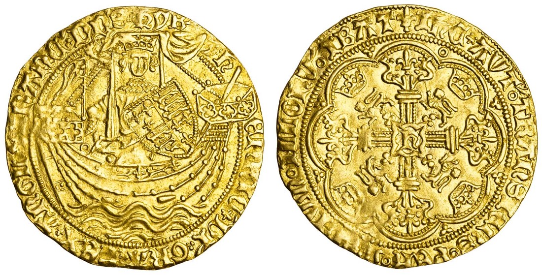 Henry VI 1íst reign (1422-61), Calais, Noble, Annulet issue, 6.92g, mm. -/lis, h/enric’• di’• gra’• rex• angl’• z• franc’• dn’s• hyb’, lis before di otherwise trefoil stops, king with sword and shield facing in ship, flag at stern, rev. ih’c* avt’ transiens per medivm illorv’ ibat, royal cross within tressure, h in panel at centre, trefoils and one annulet in spandrels (N.1415; S.1803; Schneider -; Stewartby IC: Whitton 4f), very fine, rare