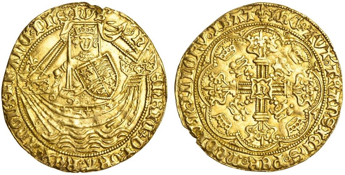 Henry VI 1íst reign (1422-61), York, Noble, Annulet issue, 6.80g, mm. -/lis, h/enric’• di’• gra’• rex• angl’• z• franc’• dn’s• hyb’, lis before di otherwise trefoil stops, king with sword and shield facing in ship, lis at stern, rev. ih’c* avt’ transiens per medivm illorv ibat, royal cross within tressure, h in panel at centre, trefoils and one annulet in spandrels (N.1416; S.1804; Schneider -; Stewartby IB), edge knock at 12 o'clock, otherwise very fine, rare