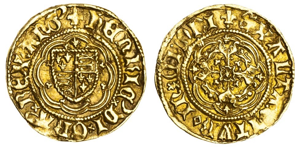 Henry VI 1íst reign (1422-61), Quarter-Noble, Leaf-Mascle issue, 1.73g, mm. lis, henric’ di gra’ rex ang’, saltire stops, lis above shield within double tressure, rev. exaltabitvr in glori, double saltire after in, leaf on inner circle, ornate cross, lis at centre, all within double tressure (N.1473; S.1829; Schneider 330; Stewartby IV; Whitton 10), noted in the Ryan catalogue as 'holed' now skilfully plugged at 1 o'clock, otherwise good very fine, extremely rare