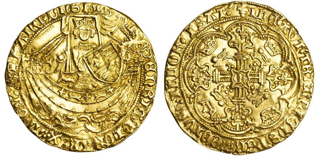 Henry VI 1íst reign (1422-61), Noble, Leaf-Trefoil issue, 6.89g, mm. -/lis, h/enric’• di• gra• rex• angl’• z• franc• dns’ hyb, leaf stops, trefoil after rex, king with sword and shield facing in ship, rev. ihc’• avt’• tranciens• per medivm• illor’• ibat’•, leaf stops, trefoil after medivm , royal cross within tressure, h in panel at centre, trefoils in spandrels (N.1482/1; S.1830; Schneider -; Stewartby V; Whitton 31/-), small edge split at 4 o'clock and a hairline crack in centre, otherwise good very fine, extremely rare