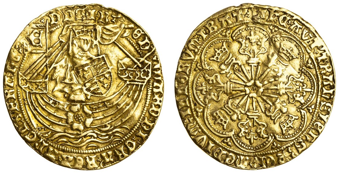 Edward IV 1íst reign (1461-70), Ryal, 7.53g, mm. -/sun, ed/ward’• di: gra’• rex• angl’• z• franc’•/• dns’•i• b’•, trefoil stops, king with sword and shield facing in ship, rose on hull below, rev. ihc’• avt’• transiens• per: medivm: illorvm:’• ibat, trefoil stops, rose upon a radiate sun over royal cross, trefoils in spandrels (N.1549; S.1950; Schneider 421; Stewartby VI; Webb-Ware 12/24), plugged at 12 o'clock, good fine