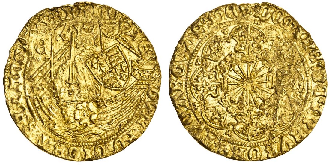 Edward IV 1íst reign (1461-70), Half-Ryal, class VIa, 3.81g, mm. sun, e/dward di gra rex ang / z franc, saltire stops, king with sword and shield facing in ship, rev. domine ne in fvrore tvo argvas me, single/double trefoil stops, rose upon a radiate sun over royal cross (N.1554; S.1959; Schneider 382; Stewartby VI), a 'found' coin, abraded surfaces and edge crack at 10 o'clock, good fine, very rare