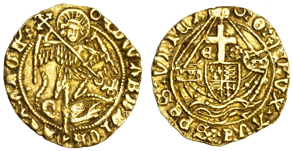 Edward IV 2índ reign (1471-85), Half-Angel, class XIV, 2.52g, mm. annulet, edward’ di gra’ rex angl’, double saltire stops, St. Michael slaying the dragon, rev. o /crvx ave spes vnica, single/double saltire stops except rose after ave, ship with square topped shield, mast dividing e and rose (N.1630; S.2093; Schneider 474 same dies; Stewartby XVI; Webb-Ware 3/4), a well struck example of this denomination, very fine, rare