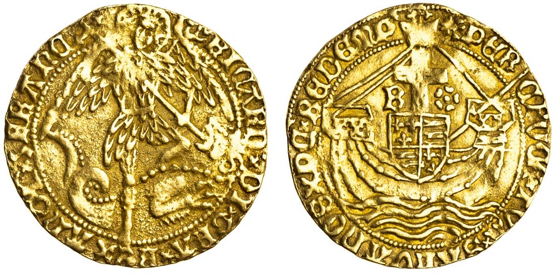 Richard III (1483-85), Angel, class 2b/3 mule, 5.15g, mm. boar’s head 2 / sun and rose 2, ricard’ di’ gra’ rex angl’ z franc’, saltire stops, St. Michael slaying the dragon, rev. per/crvce tva salva nos xpc redemp, saltire stops, ship with square topped shield, small cross mast dividing r and rose (N.1677; S.2151/2152; Schneider 494 obv; Stewartby IIb-III), struck from a worn obverse die, otherwise almost very fine, very rare, with a good provenance