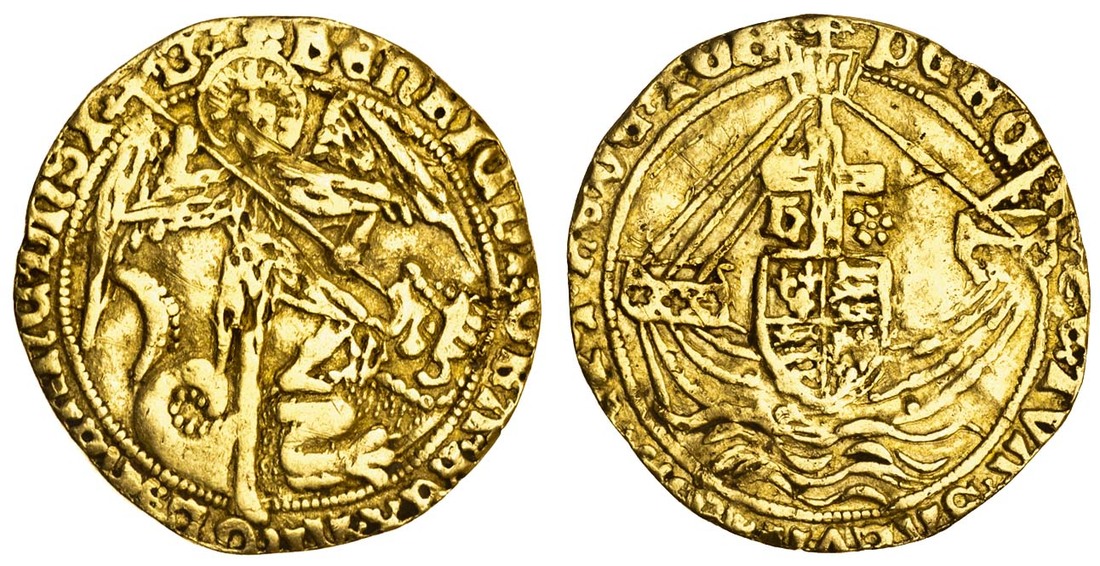 Henry VII (1485-1509), Angel, class IB, 4.95g, mm. rose/-, henric’ di’ gra’ rex angl z franc dns i/b , trefoil stops, St. Michael slaying the (early style) dragon, rev. perc/rvce’ tva’ salva [ ] rede tor, trefoil stops, ship with square topped shield, mast dividing h and rose (N.1694; S.2179A; Schneider 507/-; Stewartby IB), scratch in front of face, a little small, good fine, very rare