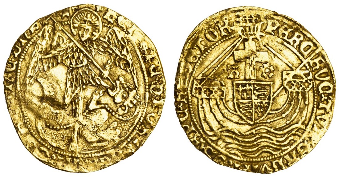 Henry VII (1485-1509), Angel, class IIA/B mule, 5.08g, mm. -, henric di gra rex angl z franc dns, trefoil stops, St. Michael slaying the dragon, rev. perc/rvc’ tva’ salva nos xpc redetor, trefoil stops, ship with square topped shield, mast dividing h and larger rose (N.1695; S.2181; Schneider -; Stewartby IIIBi), has been creased and straightened, flaw by dragon's tail, good fine, very rare