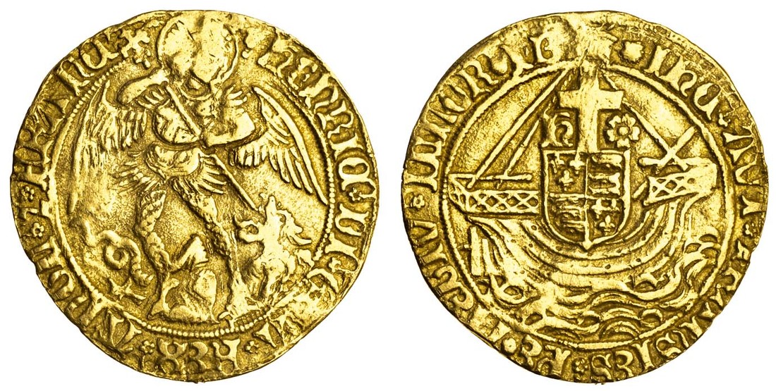 Henry VII (1485-1509), Angel, class IIIB, 5.06g, mm. escallop, henric’ di’ gra’ rex’ angl’ z franc’, rosette stops, St. Michael slaying the (new style) dragon, rev. ihc avt transies pe mediv illor ib, rosette stops, ship with square topped shield, mast dividing h and rose (N.1696; S.2184; Schneider 516-7; Stewartby IIIBi), good fine, a very rare reverse legend type