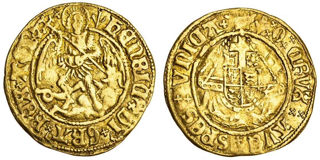 Henry VII (1485-1509), Half-Angel, class V, 2.48g, mm. pheon, henric di’ gra’ rex agl’ z, saltire stops, St. Michael slaying the dragon, rev. o crvx ave spes vnica, double saltire stops, ship with square topped shield, mast dividing h and rose (N.1702; S.2192; Schneider 546; Stewartby Vii), a full coin, fine or better