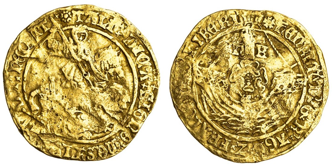Henry VIII (1509-47), George-Noble, second coinage, 4.53g, mm. rose, henric d’ g’ r’ agl’ z franc’ dns’ hiberi’, saltire/double saltire stops, ship with double-rose, the mast dividing h and k, rev. tali dica signo mes flvctvari neqvit, double saltire stops, around St. George slaying the dragon (N.1785/1; S.2270; Schneider 576; Stewartby 2), has been creased and flattened, some light marks, otherwise full, fair or better, a very rare type coin