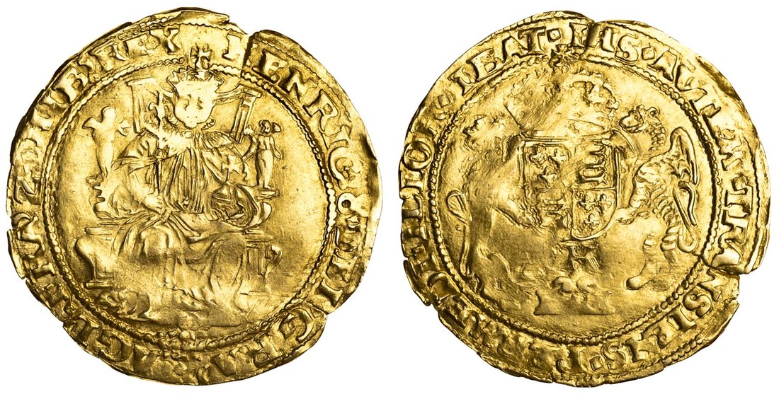 Edward VI (1547-53), Posthumous coinage in the name of Henry VIII, Tower II, Half-Sovereign, 6.17g, mm. -, henric’ 8 dei gra’ agl’ fra’ z hib’ rex, lozenge stops, youthful king enthroned facing, holding orb and sceptre, rose below, rev. his avtem transiens permedi illor ibat, lozenge stops, crowned square topped shield with supporters, k below (N.1865; S.2392; Schneider 656; Stewartby p.520), small edge splits and lightly creased, face weak, otherwise very fine