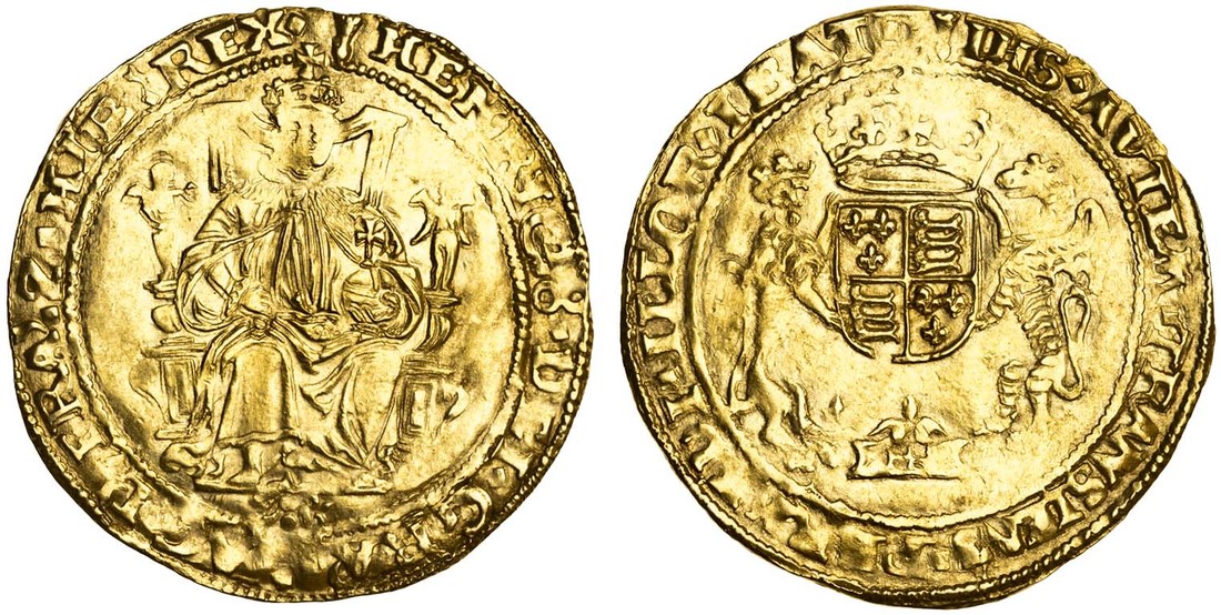 Edward VI (1547-53), Posthumous coinage in the name of Henry VIII, Tower I, Half-sovereign, 5.89g, mm. arrow, henric’ 8 dei gra’ agl’ fra’ z hib’ rex, lozenge stops, youthful king enthroned facing, holding orb, rose below, rev. his avtem transiens permedi illor ibat, lozenge stops, crowned square topped shield with supporters, hr below (N.1865; S.2391A; Schneider 645; Stewartby p.520), slightly weak on face, otherwise toned, well struck with good detail, good very fine, rare