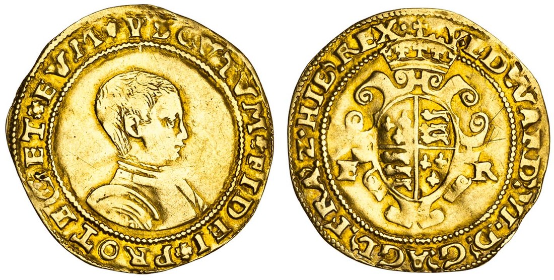 Edward VI (1547-53), Half-Sovereign, Southwark, second period, 4.95g, mm. Y, scvtvm fidei proteget evm, rosette stops, bare-headed bust right, rev. edward’ vi d’ g’ agl’ fra’ z hib’ rex, lozenge stops, crowned and garnished oval shield dividing e r  (N.1908; S.2435; Schneider 686; Stewartby 1b), some faint scratches under an attractive old tone, lightly creased, almost very fine, rare