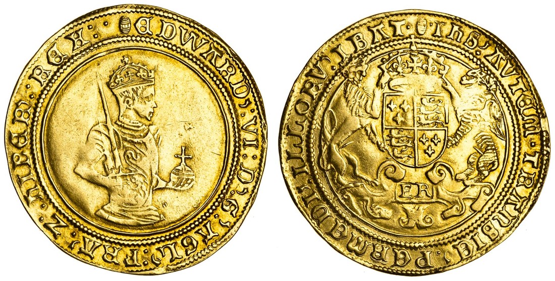 Edward VI (1547-53), Sovereign, Tower, Third period, 11.13g, mm. tun, edward’ vi d’ g’ agl’ fra’ z hiber’ rex, lozenge stops, king half bust right, holding sword and orb, rev. ihs' avtem transie’ permedi’ illorv’ ibat, lozenge stops, crowned square topped shield with supporters, er below (N.1927; S.2450; Schneider 692), an attractive full round coin, lightly creased in centre, very fine, rare