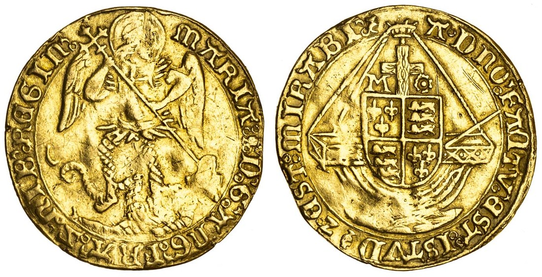 Mary (1553-54), Angel, 4.68g, mm. pomegranate, maria mm d’ g’ ang’ fra’ z hib’ regin’, annulet stops, St. Michael slaying the dragon, rev. a dno’ factv’ est istvd mm z est mirabi’ c, ship with square topped shield, the mast dividing m and rose above (N.1958; S.2490; Schneider 713), a light crease and mark on angel's head, good fine or better, rare