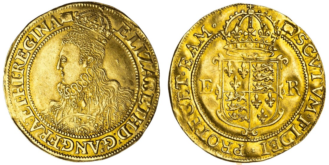 Elizabeth I (1558-1603), Pound, sixth issue, 11.15g, mm. woolpack, elizabeth• d! g! ang! fra! et• hi! regina, crowned bust left with a profusion of hair in elaborate dress, rev. scvtvm fidei proteget eam, square topped shield, dividing e r, crown above (N.2008; S.2534; Schneider 799), a handsome portrait coin, slightly creased, otherwise toned, very fine or better