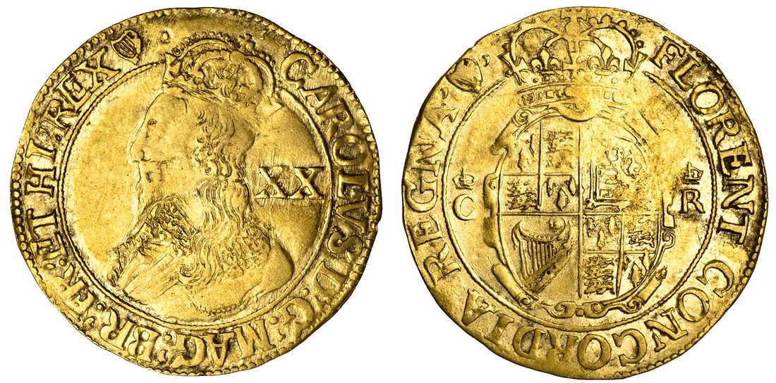 Charles I (1625-49), Unite, group D, 8.92g, mm. harp, •carolvs d! g! mag! br! fr! et hi! rex, crowned bust left with falling lace collar, mark of value behind, rev. florent concordia regna•, pellet after mintmark, crowned oval shield dividing crowned c r (N.2152; S.2691; Schneider -), softly struck in parts, good fine