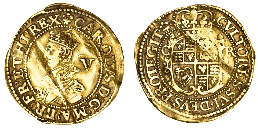 Charles I (1625-49), Crown, group C, 2.24g, mm. plume, •carolvs• d! g! ma! br! fr! et• hi! rex•, third crowned bust left with mantle, mark of value behind, rev. cvltores• svi• devs• protegit•, crowned, garnished oval shield dividing c r (N.2183; S.2714; Schneider 241 same dies), has been creased and straightened, good fine, rare as a true type coin