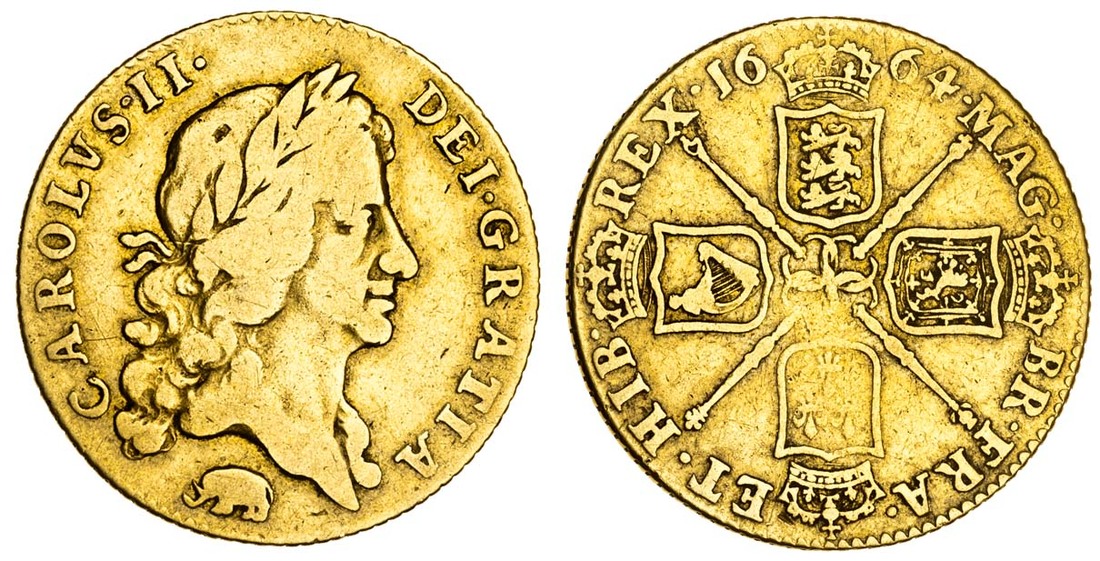 Charles II (1660-85), Guinea, 1664, 8.21g, carolvs• ii• dei• gratia•, third laureate bust left, elephant below, rev. •mag• / br• fra• / et• hib• / rex•, date divided by four crowned shields cruciform, sceptres in angles, four interlinked Cs at centre (MCE 57; S.3343), about fine