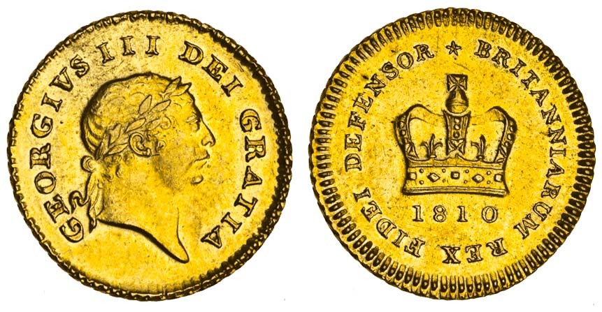 George III (1760-1820), Third Guinea, 1810, 2.80g, georgivs iii dei gratia, second laureate head right, rev. britanniarum rex fidei defensor, crown, date below within (MCE 460; S.3740), almost extremely fine