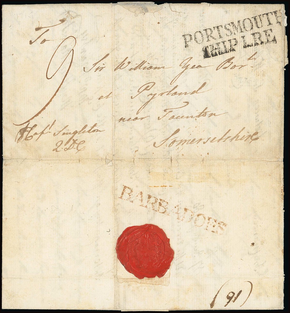 1770 (13 May) entire letter to Somerset, marked "p Capt Singleton Q.D.C.", showing fine strike of unframed "portsmouth/ship lre" and, on reverse, good to fine straight-line "barbadoes". Photo