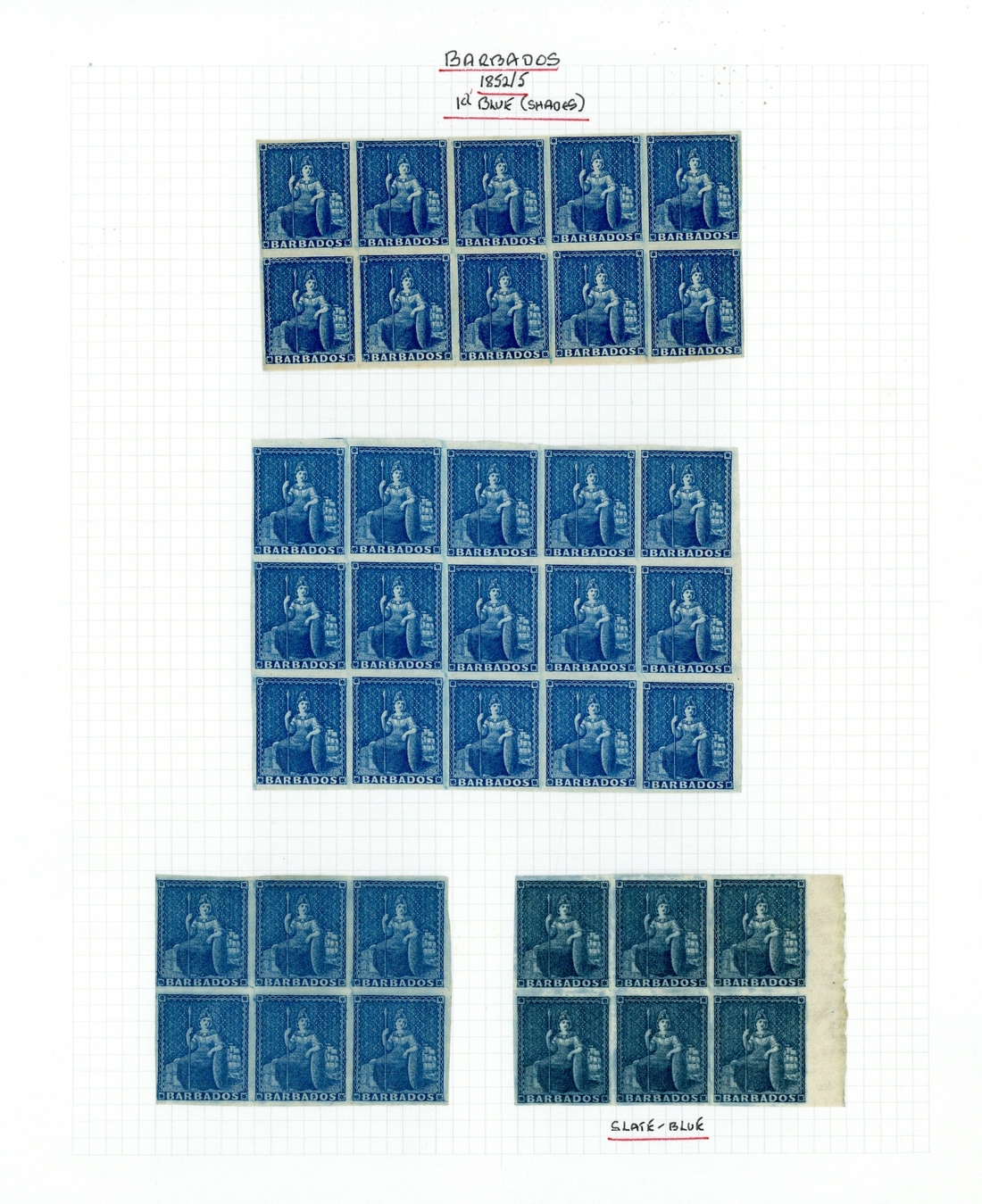 (1d.) blue (shades) comprising blocks of fifteen, ten, six and four (2), strip of four (worn plate), vertical pair and singles (5, four used, one from worn plate), and prepared for use but not issued, slate-blue blocks of sixteen, six (2), four and a single, and deep slate single, fine. S.G. 3-4, 5a, 5b, £3900