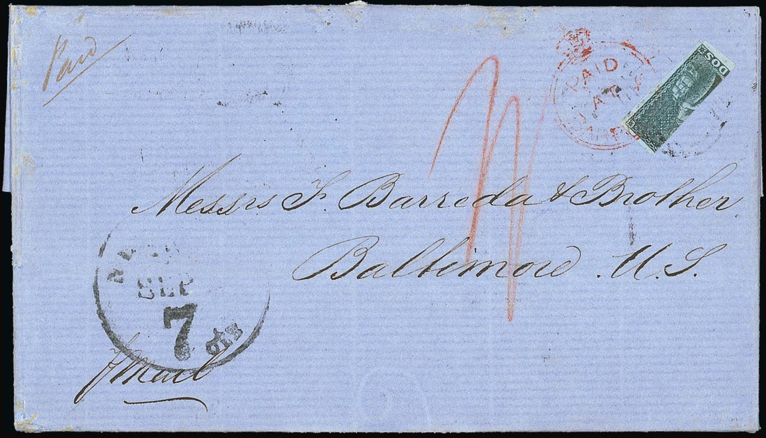 1854 (11 Aug.) entire letter to Baltimore, rated "1/-" in red, bearing (2d.) greyish slate bisected vertically and tied by light barred numeral "1" and fine Crowned circle "paid/at/barbadoes" in red, showing "new york/ship/7 cts" c.d.s. and, on reverse, despatch, St. Thomas (15.8) and Kingston (22.8) datestamps. A fine and most attractive example of a bisect cover. S.G. 4b, £8500. Photo