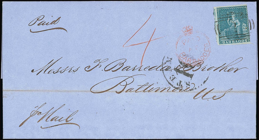 1856 (11 Aug.) entire letter to Baltimore, rated "4" in red, bearing (1d.) blue (cut-into at right) tied by barred numeral "1", showing clear Crowned circle "paid/at/barbadoes" in red alongside, partly overstruck by "steamship/10" circular h.s. and, on reverse, despatch and St. Thomas (14.8) datestamps; the face panel crossed by horizontal filing crease, clear of handstamps and stamp. S.G. 3. Photo