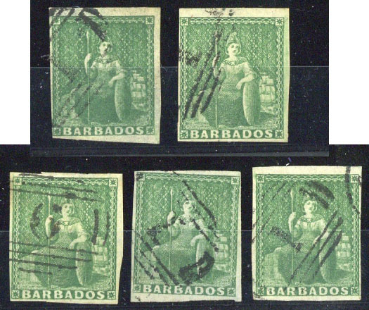 (½d.) green (shades), five examples with mainly good to large margins (three cut close on one side), four with barred numeral "1" and one with "6", good to fine. S.G. 7/8