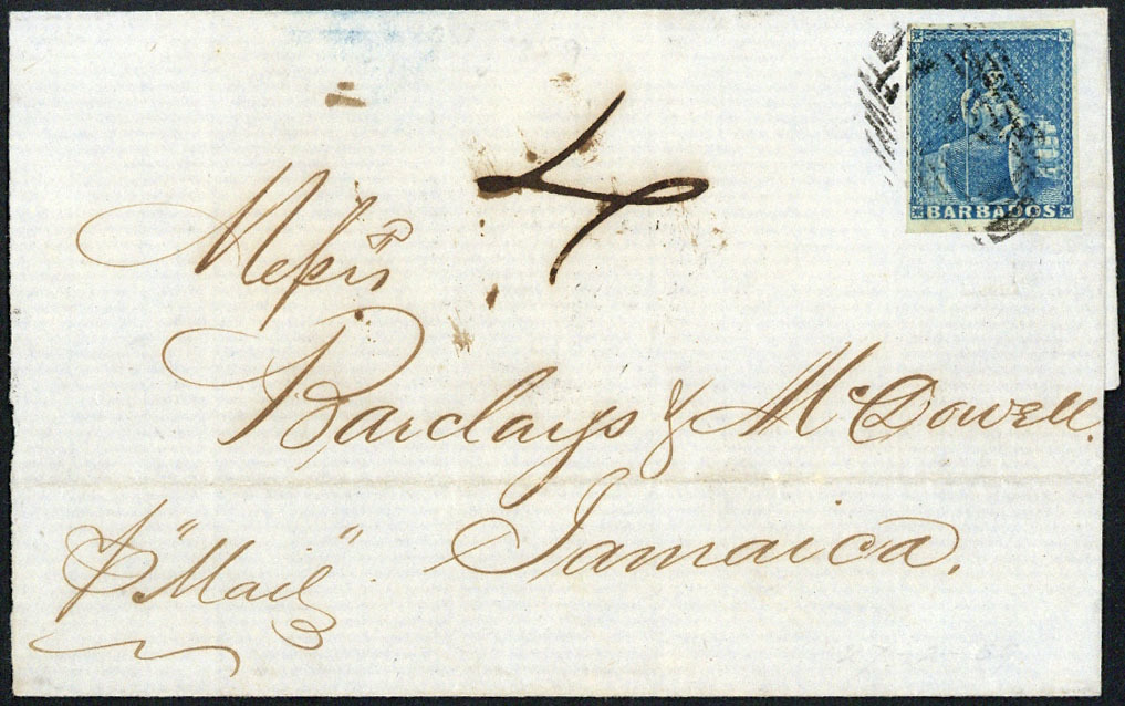 1859 (27 Feb.) entire (one side flap missing) to Jamaica, rated "4", bearing (1d.) blue with good to large margins, clearly tied and showing, on reverse, despatch, St. Thomas (2.3) and arrival (10.3) datestamps. S.G. 9