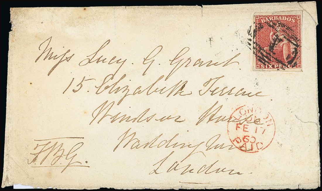 1860 (27 Jan.) envelope to London, bearing 6d. deep rose-red with good to large margins, clearly tied by barred numeral "1", showing red Paid arrival c.d.s. (17.2) below with despatch datestamp on reverse; the envelope with bottom flap missing, some minor peripheral faults and a little soiled. S.G. 11a. Photo