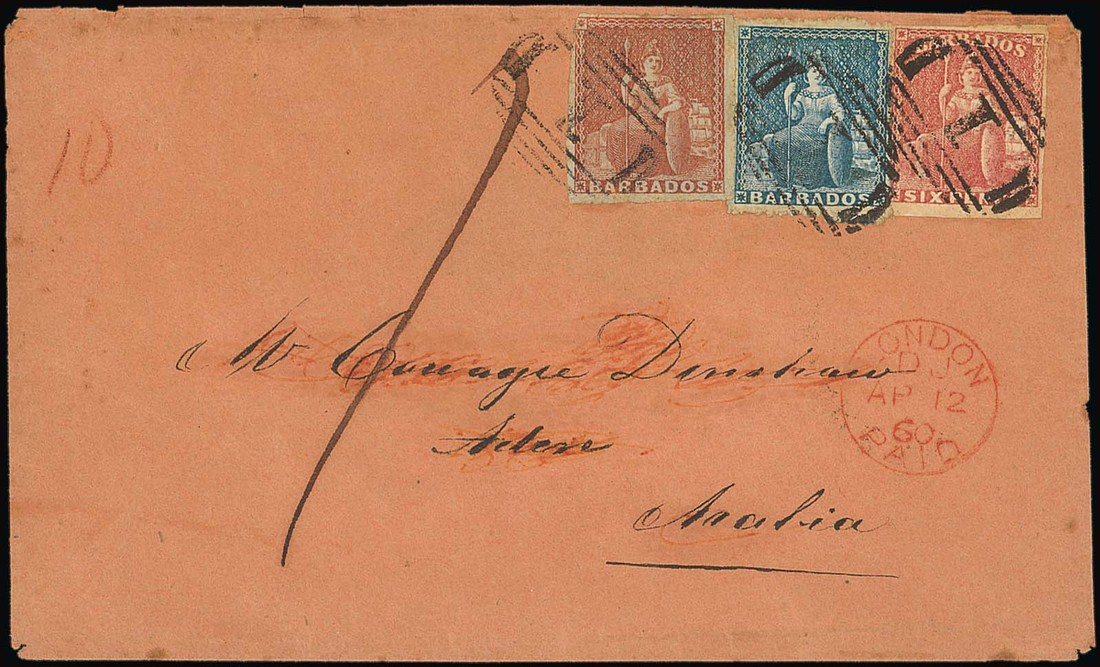 1860 (25 Mar.) envelope to Aden, rated "10" in red crayon and "1", bearing (1d.) blue pin-perf 14, in combination with (4d.) brownish red and 6d. pale rose-red, all tied by barred numeral "1", showing red London Paid c.d.s. (12.4) and, on reverse, despatch and arrival (3.5) datestamps. A unique franking to a most remarkable destination. Robson Lowe Certificate of Opinion (1969). S.G. 5, 11, 14. Photo