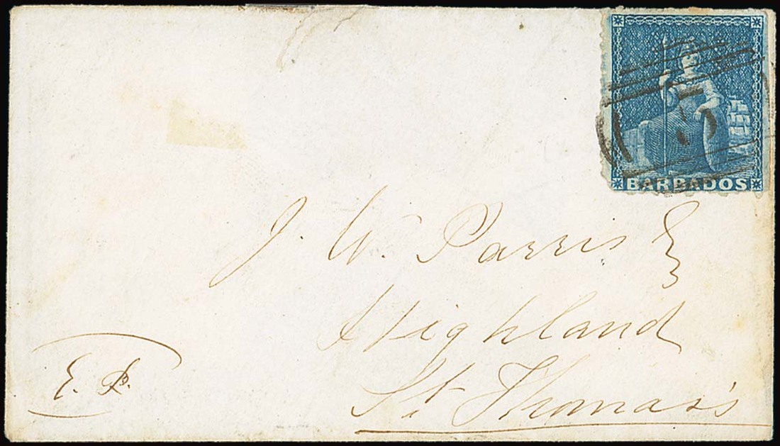 1861 (26 Mar.) lady's envelope from St. John to St. Thomas, bearing (1d.) blue pin-perf 14 centrally cancelled by barred numeral "5" and showing, on reverse, "5" and "8" datestamps. S.G. 14. Photo