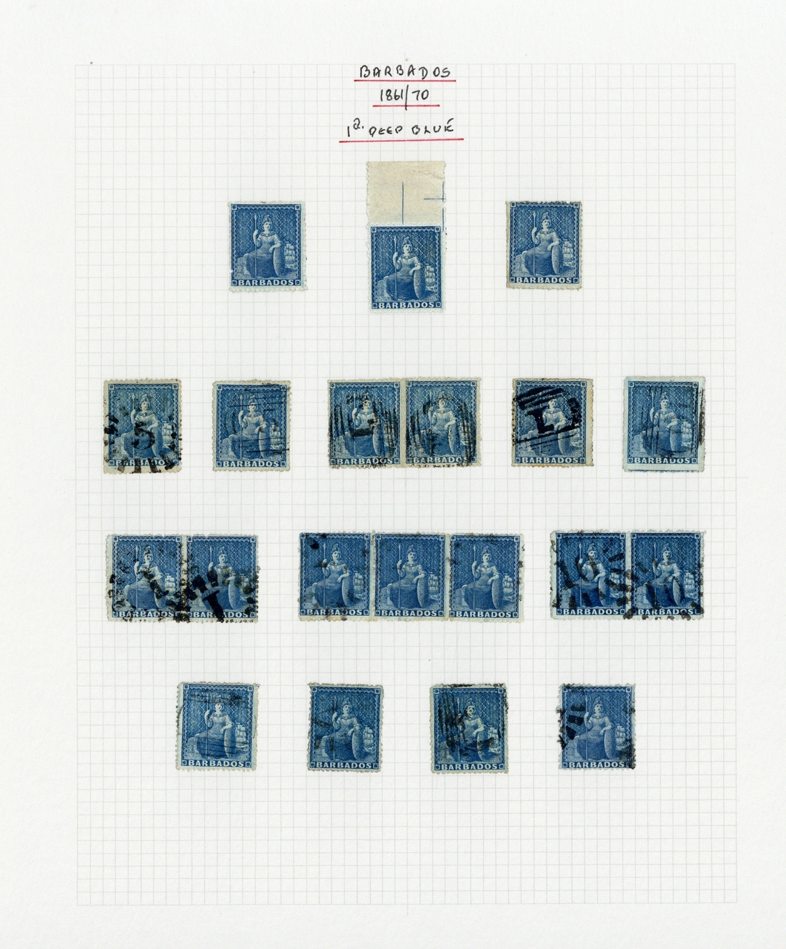 (1d.) blue (shades) range comprising blue unused (3) and used (10 including a pair) and deep blue unused (3, one with sheet margin at top) and used (17 including a strip of three and three pairs), the unused with part or large part original gum; mostly fine. S.G. 23-24, £550+