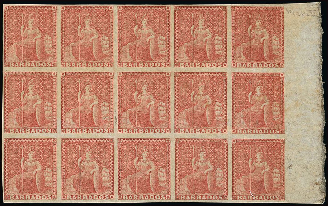 (4d.) dull rose-red block of fifteen (5x3) with sheet margin at right, variety imperforate, unused with large part or full original gum, three with tiny thins otherwise fine. A superb and very rare multiple. S.G. 25a, £7700+. Photo