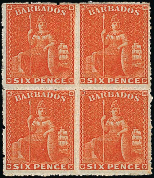 6d. bright orange-vermilion block of four, unused with mainly large part original gum, fine. R.P.S. Certificate (1994), S.G. 31, £640. Photo