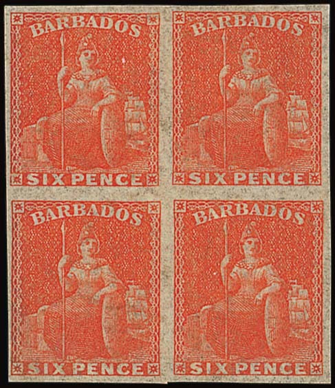 6d. dull orange-vermilion block of four, variety imperforate, unused with large part original gum, faint trace of soiling otherwise fine. S.G. 32a, £1500. Photo