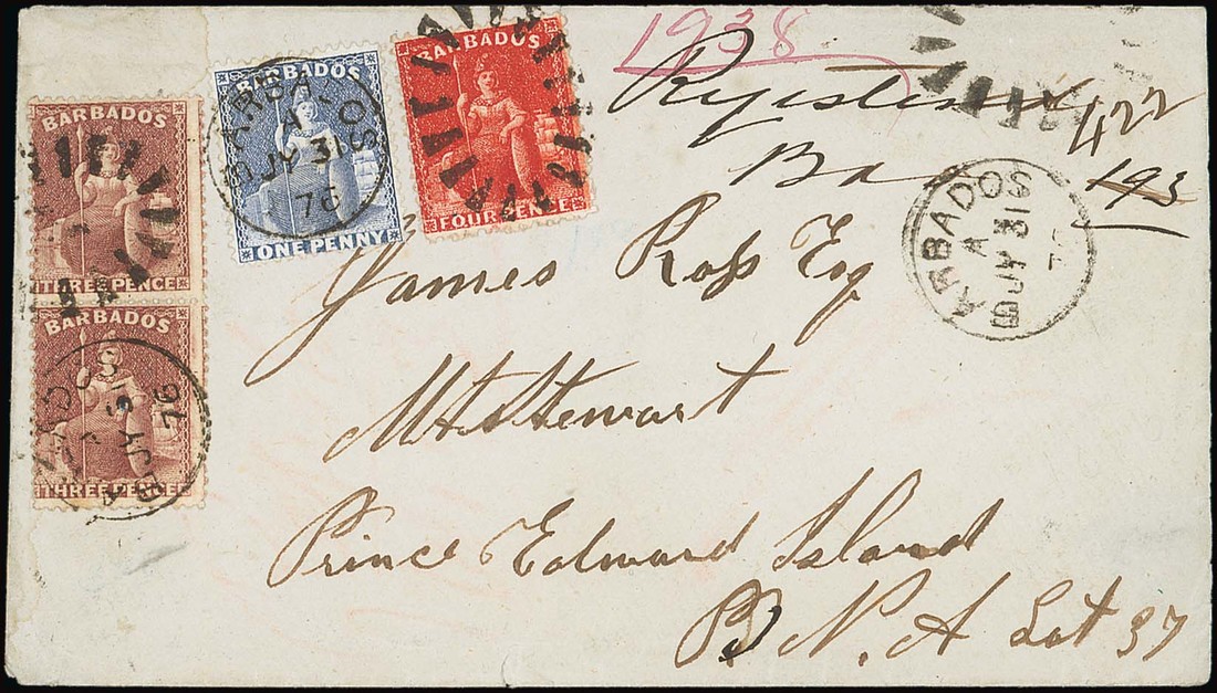 1876 (31 July) envelope registered to Prince Edward Island, bearing 3d. brown-purple vertical pair with 1875-80 perf 12½ 4d. deep red and perf 14 1d. dull blue, all tied by 'boot-heel' duplex and showing, on reverse, St. Thomas (13.8), Halifax (26.8), Charlotte Town (28.8) and "p.e.i.r.r.c & s/east" (28.8) datestamps. A unique and most attractive three colour franking. S.G. 63, 68, 73. Photo