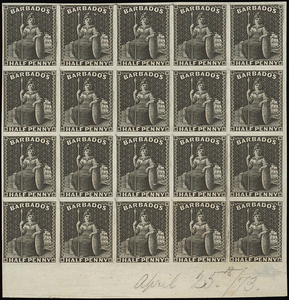 ½d. in black on wove paper, a block of twenty (5x4) with sheet margin at foot showing manuscript "April 25th 73", fine. The largest recorded multiple. Photo