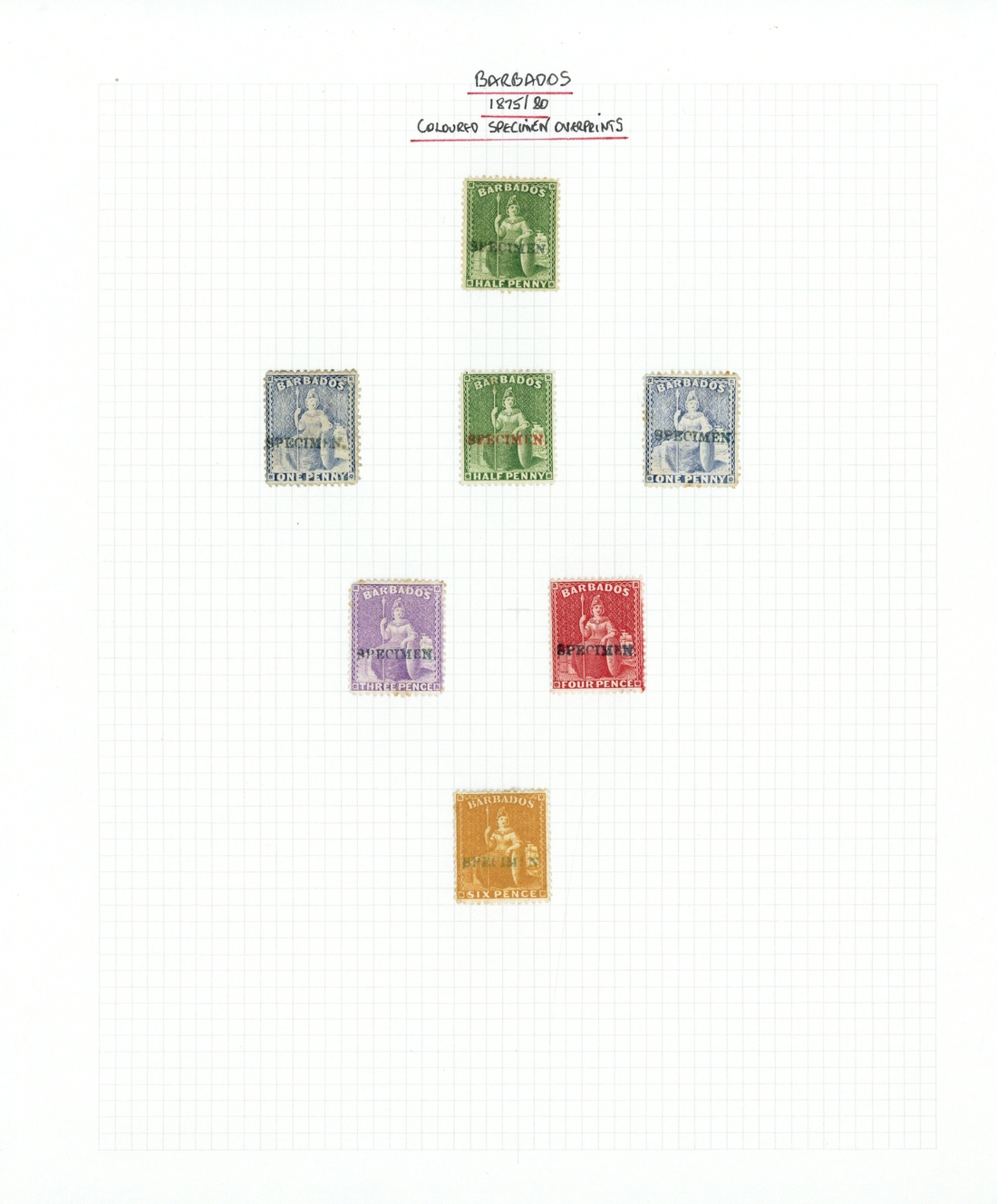 A selection of "specimen" handstamps (Type BAR1) on ½d. bright green in red and in black, 1d. dull blue in black (2), 3d. mauve-lilac in black, 4d. red in black and 6d. chrome-yellow in blue, all without gum except 6d., and one 1d. and the 3d. with some stained perfs, otherwise fine