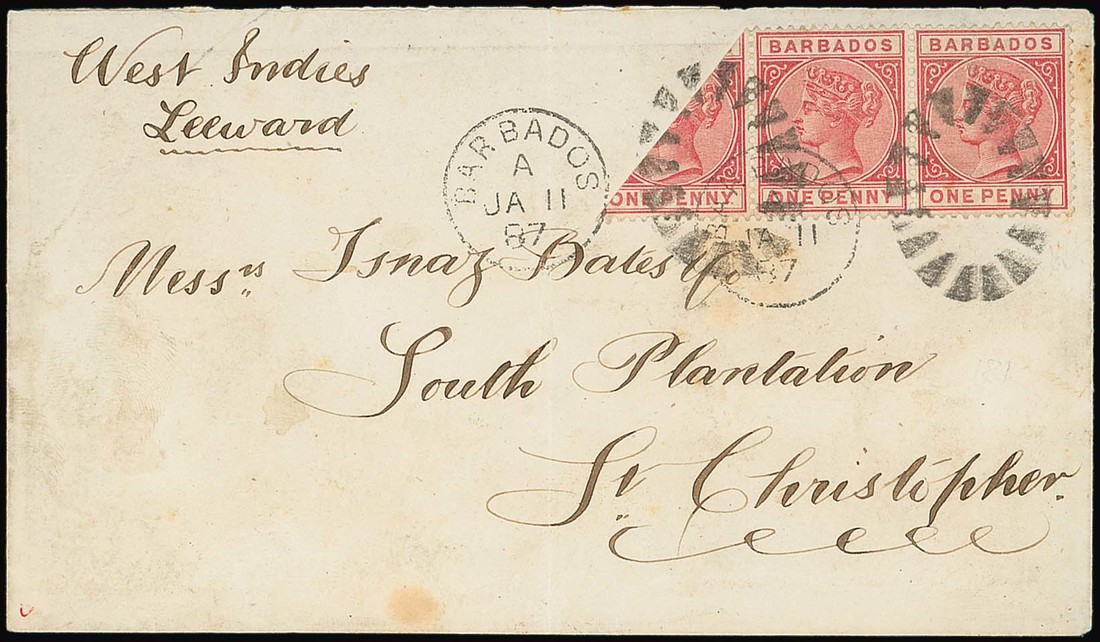 1d. rose strip of three with one bisected diagonally, clearly tied by duplex on 1887 (11 Jan.) envelope to St. Christopher; the cover with light central vertical crease and small tone spot at foot, neither of which affects the fine appearance. Rare. B.P.A. Certificate (1965). S.G. 91a, £1700. Photo