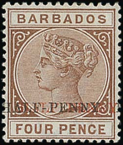 1892 (July) half-penny" on 4d. deep brown, variety surcharge double, in red and in black, unused with large part original gum, light diagonal crease at upper right otherwise fine. Rare. S.G. 104b, £900. Photo