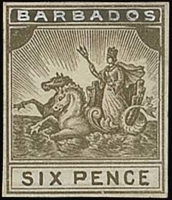 6d. in deep olive-green with handpainted value in the same colour and "barbados" in Chinese white, on gummed unwatermarked paper, small margins, fine. Photo