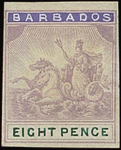 8d. in pale violet with handpainted value in deep green and "barbados" in Chinese white on deep violet background, on gummed unwatermarked paper, small margins on three sides, light vertical bend otherwise fine. Photo