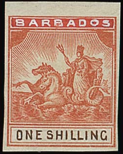 1/- in red-brown with handpainted value in dark brown and "barbados" in Chinese white, on gummed unwatermarked paper, small margins on three sides, light diagonal crease otherwise fine. Photo