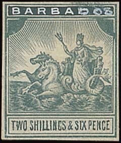 2/6d. in grey with handpainted value in the same colour and "barbados" in Chinese white, on gummed unwatermarked paper, small margins, two horizontal creases and slight rubbing at top right otherwise fine. Photo
