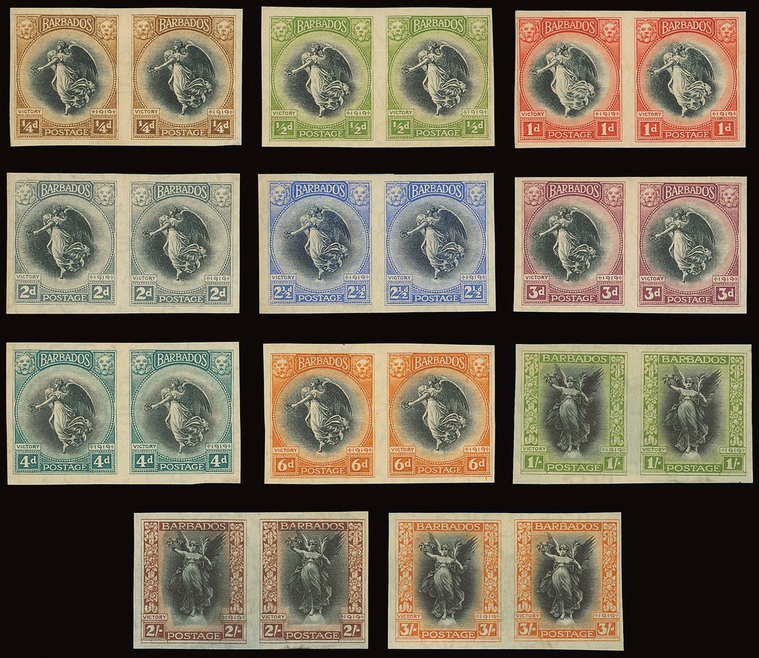 ¼d. to 3/- set of eleven horizontal pairs in issued colours on gummed watermarked paper, traces of light overall gum toning though barely apparent on the surface and in no way detracting. An exceedingly rare set - Bayley states that "only two set of these plate proofs in pairs and a set in singles have been recorded". Photo