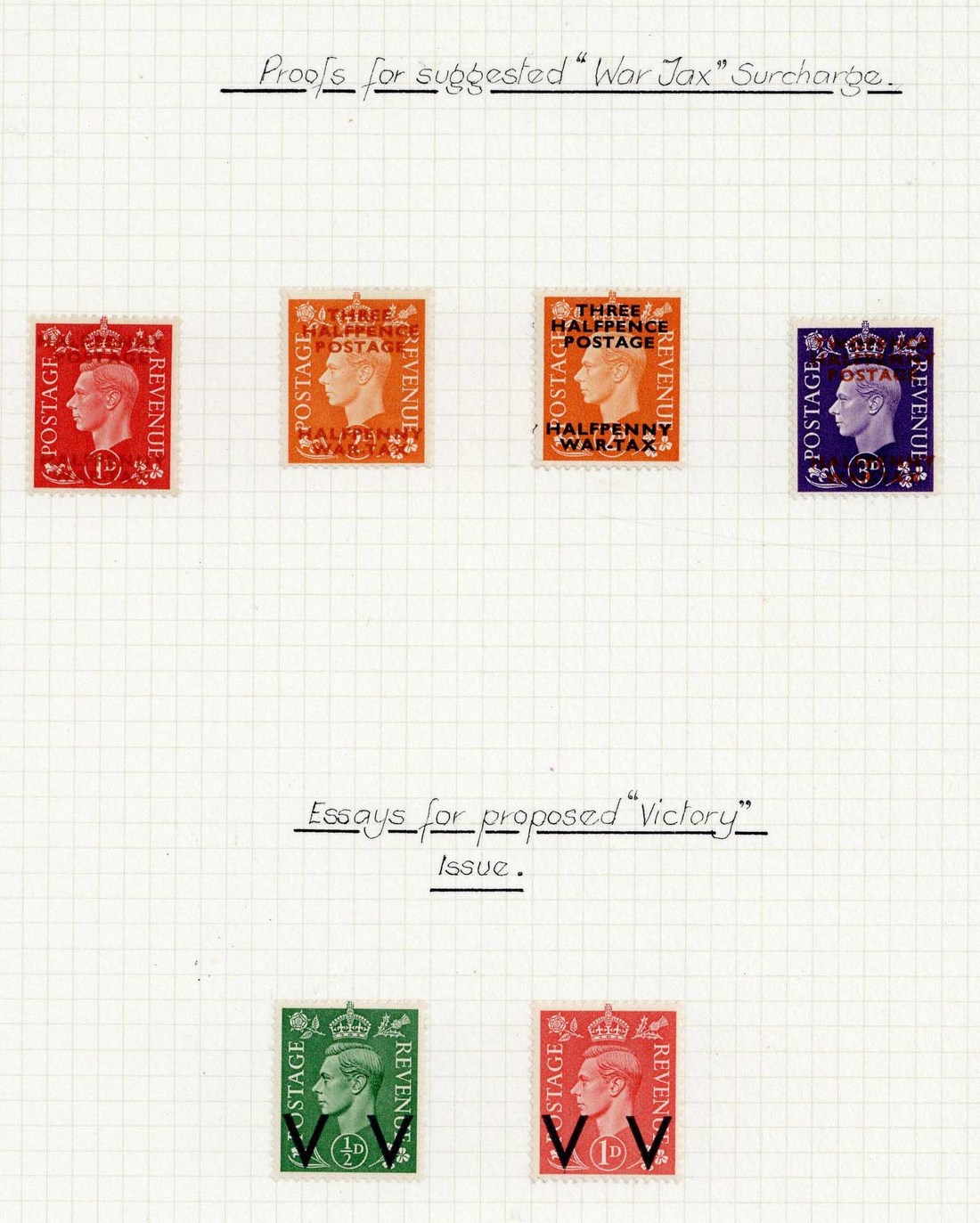 1940 "three/halfpence/postage/halfpenny/war tax" surcharge essays on 1937 1d., 2d. and 3d. in red and on 2d. in black, and 1942-43 proposed Victory issue 1942-43 ½d. and 1d. both overprinted "v v" at foot; fine mint