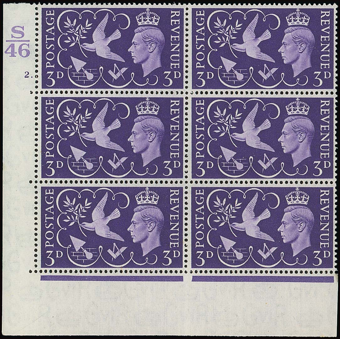 1946 Victory 3d. Cylinder 2 and 2 with dot corner blocks of six, fresh mint with the latter unmounted. A rare pair. R.P.S. Certificate (1988) for the dot block. S.G. cat. £200 for the no dot block and unpriced for the with dot block. Photo