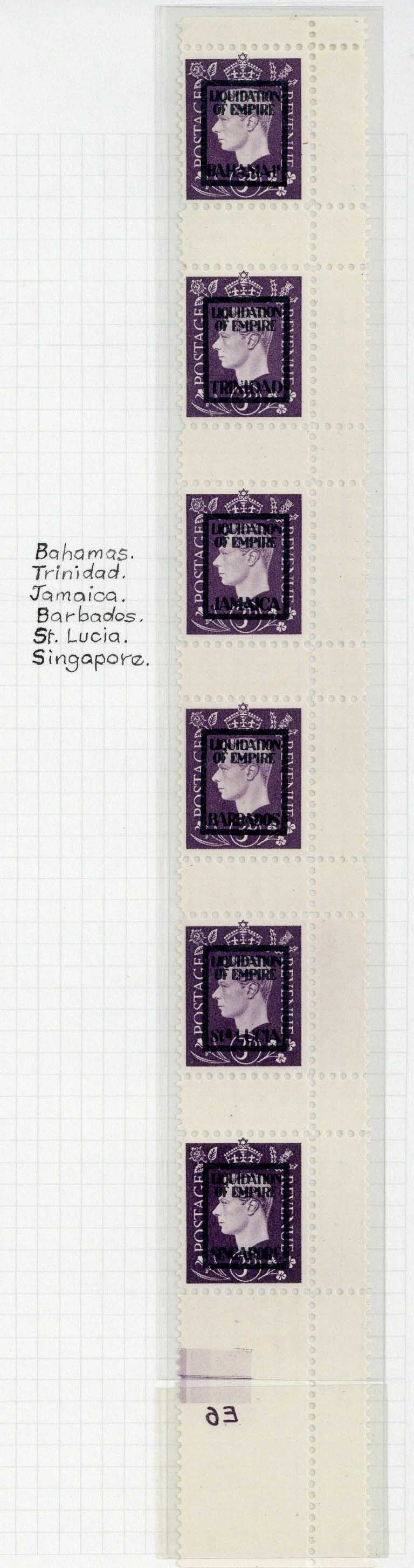 Bahamas, Barbados, Jamaica, St. Lucia, Singapore and Trinidad 3d. unused vertical strip of six with sheet margins on three sidesF